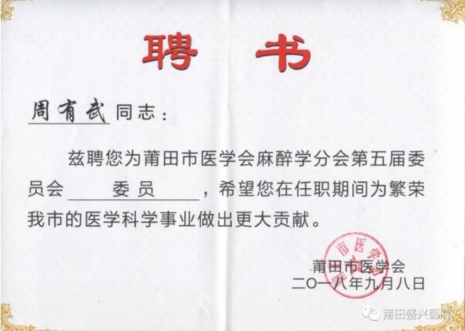 熱烈祝賀盛興醫(yī)院麻醉科主任   周有武當(dāng)選莆田市醫(yī)學(xué)會(huì)   麻醉學(xué)分會(huì)第五屆……