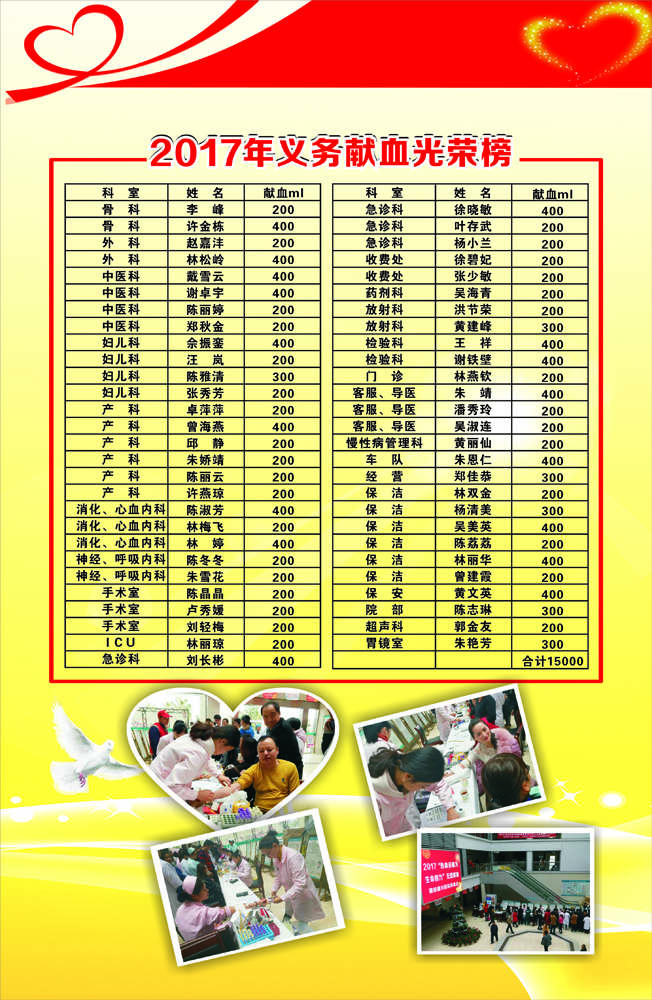 按照事先安排,先是行政后勤人員先來獻(xiàn)血。接下來是醫(yī)技和臨床醫(yī)護(hù)人員,副院長(zhǎng)陳志琳、孕婦學(xué)校主任曾海燕、慢性病科主任黃麗仙等領(lǐng)導(dǎo)帶頭獻(xiàn)出200—400ml獻(xiàn)血。幾位女職工還動(dòng)員自己的丈夫一起加入獻(xiàn)血行列。至活動(dòng)結(jié)束,全院一共獻(xiàn)出近16000ml鮮血。