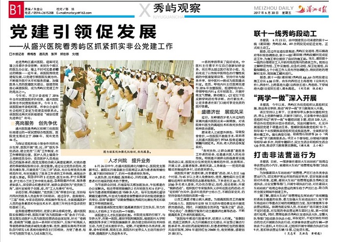 前言:盛興醫(yī)院是秀嶼區(qū)按照三級(jí)醫(yī)院標(biāo)準(zhǔn)建設(shè)的一家民營(yíng)綜合性醫(yī)院,現(xiàn)有員工516人。醫(yī)院黨支部成立于2008年12月,現(xiàn)有黨員46名,其中正式黨員14名、預(yù)備黨員4名、“雙報(bào)到”黨員28名。醫(yī)院黨支部成立以來(lái),緊緊圍繞黨建促發(fā)展,構(gòu)筑四個(gè)平臺(tái),發(fā)揮四個(gè)作用,提升醫(yī)院服務(wù)水平。醫(yī)院先后被省、市、區(qū)誠(chéng)信促進(jìn)會(huì)授予誠(chéng)信企業(yè)先進(jìn)單位;被市總工會(huì)授予先進(jìn)職工小家和職工書(shū)屋;急診科先后被全國(guó)、省、市總工會(huì)授予“工人先鋒號(hào)”;重癥醫(yī)學(xué)科被省總工會(huì)授予“五一巾幗標(biāo)兵崗” 等榮譽(yù)稱號(hào)。今年3月被市委組織部、市非公企業(yè)和社會(huì)組織工委定為黨建直接聯(lián)系點(diǎn)。