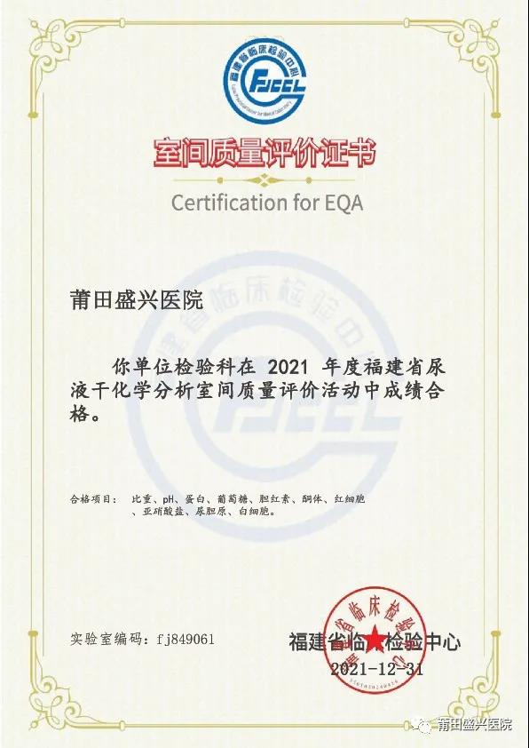 (下面圖片為2021年參加福建省常規(guī)化學(xué)室間質(zhì)量評價(jià)獲得的證書)